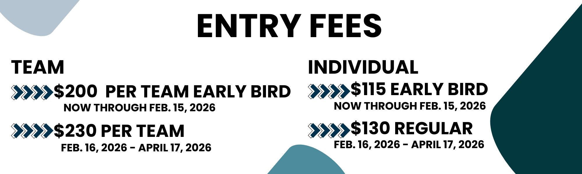 • Early Bird: $200 per team / athlete